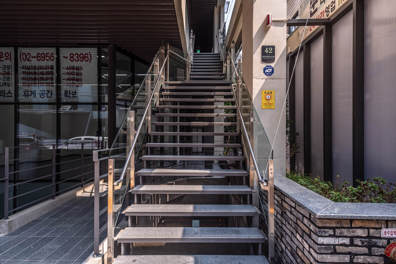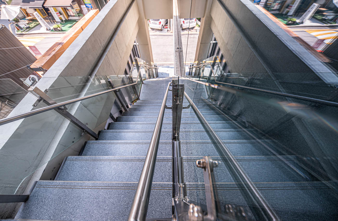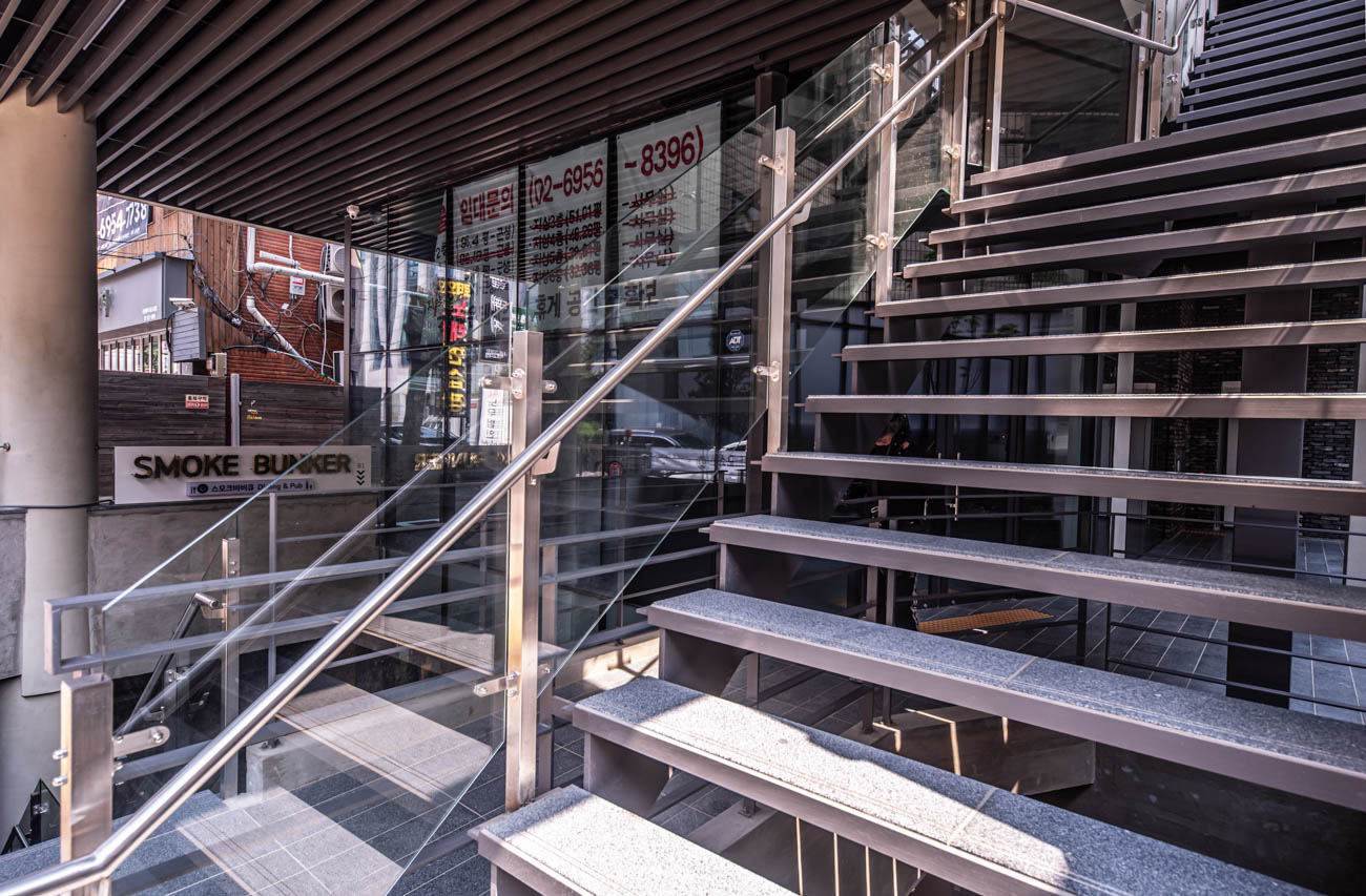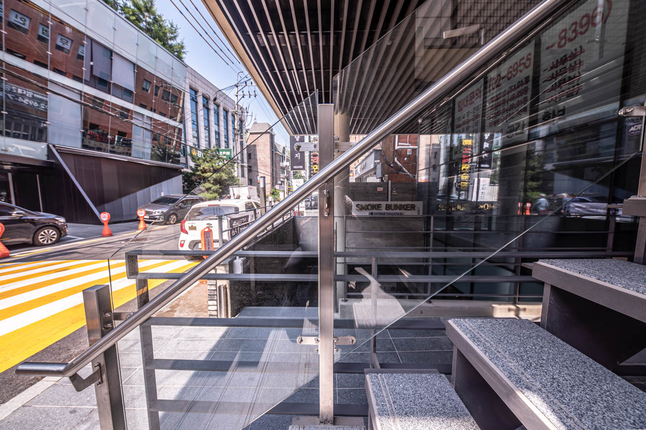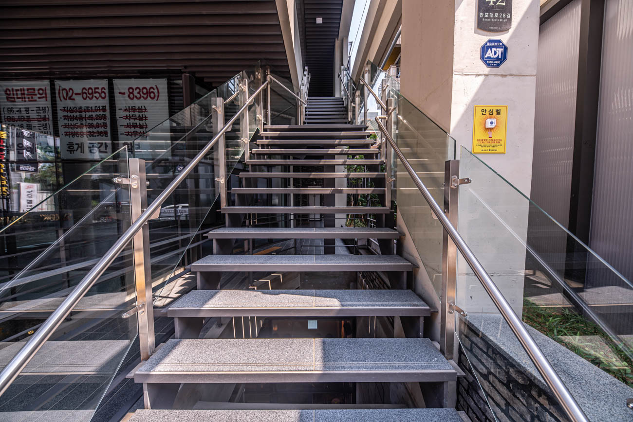 지하 2층으로 내려가는 계단과 지상 2층으로 오르는 계단 구간에 저희 난간몰의 유리난간이 설치되었습니다.