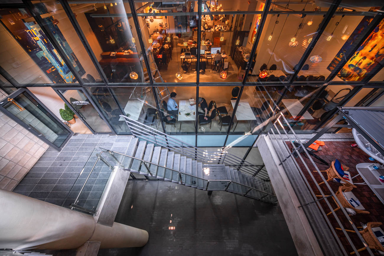1층에서 지하를 내려다보면, 건물 중앙부의 뻥 뚫린 공간을 따라 유리난간이 수직으로 이어지며 공간감을 더욱 강조해줍니다.