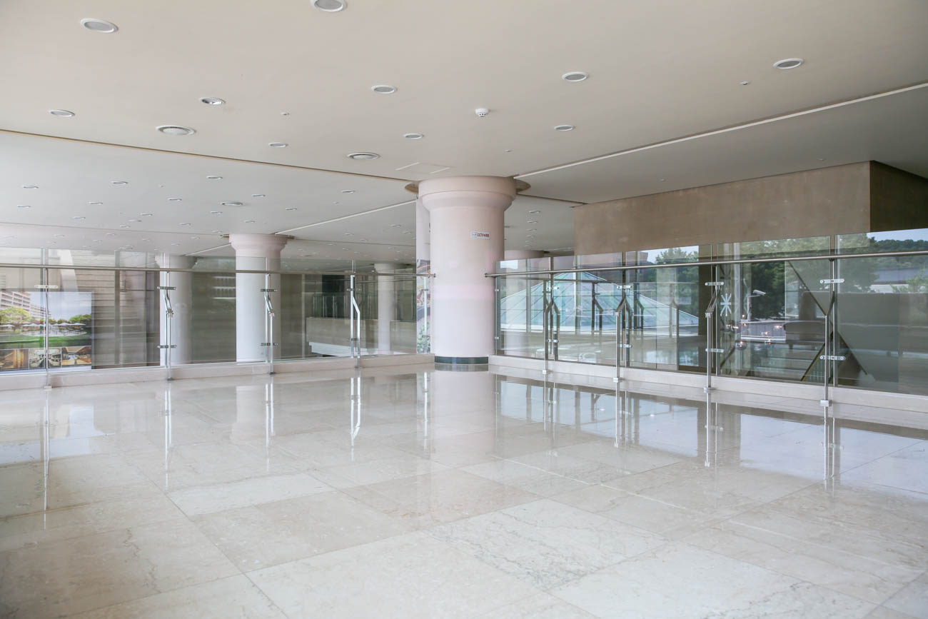 2층 복도 전 구간에 강화유리 난간을 설치해 로비가 더욱 넓고 밝게 보이도록 했습니다.