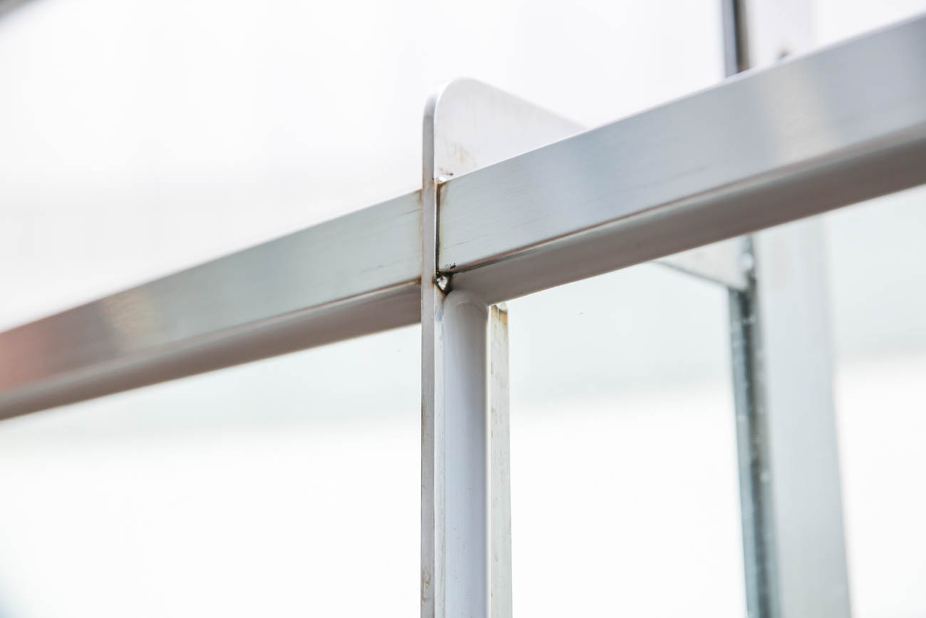 - 프레임: 각파이프 보강 후 유리 브라켓 체결