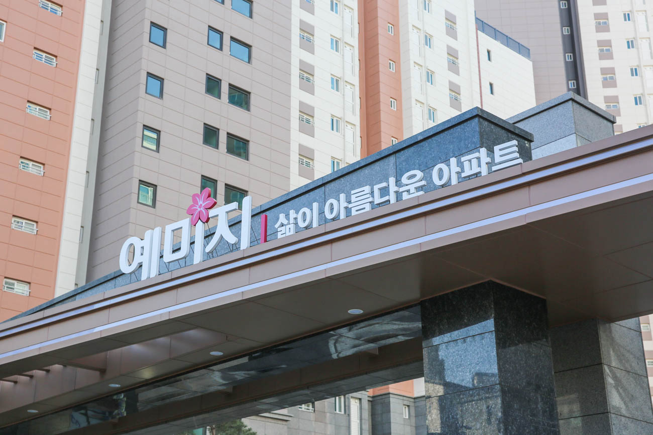 금성백조 예미지는 1,770세대 규모의 대단지 아파트로, 단지 곳곳에 조형물과