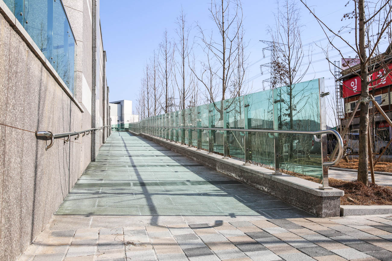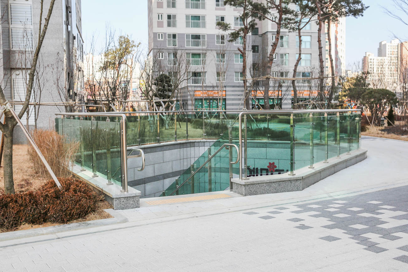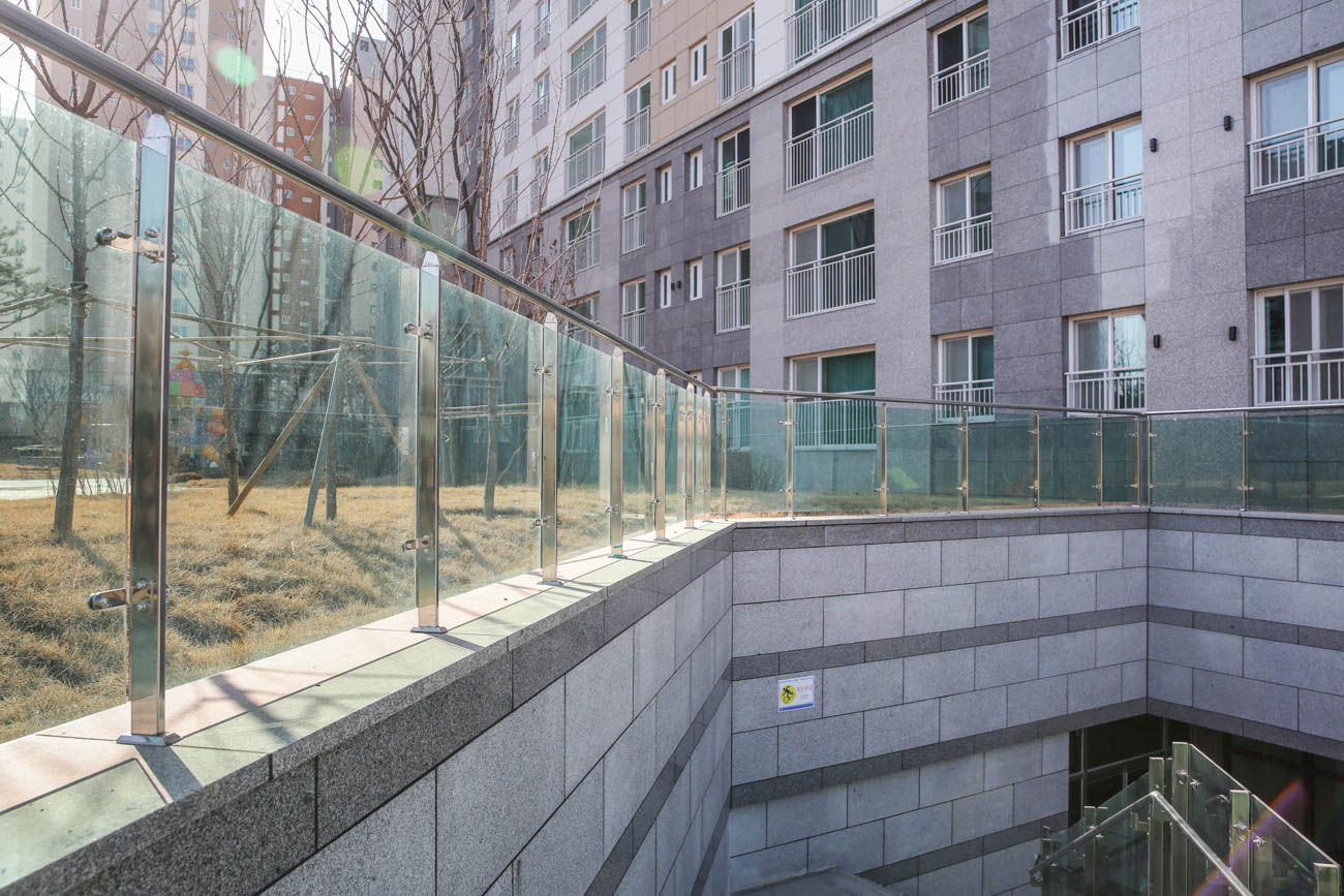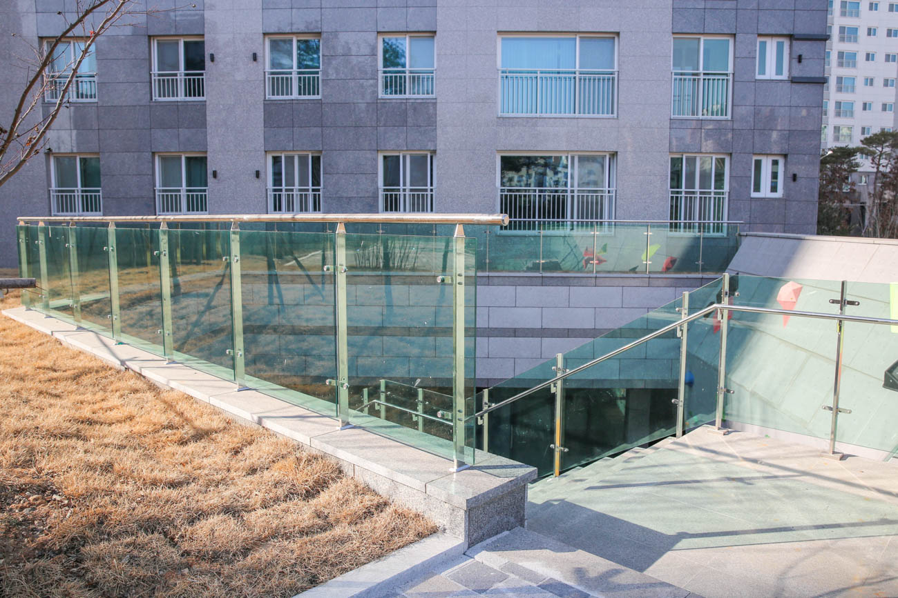 난간몰은 단지 내 썬큰 2개 구간과 외부 슬로프·계단에 강화유리난간을 시공하여,