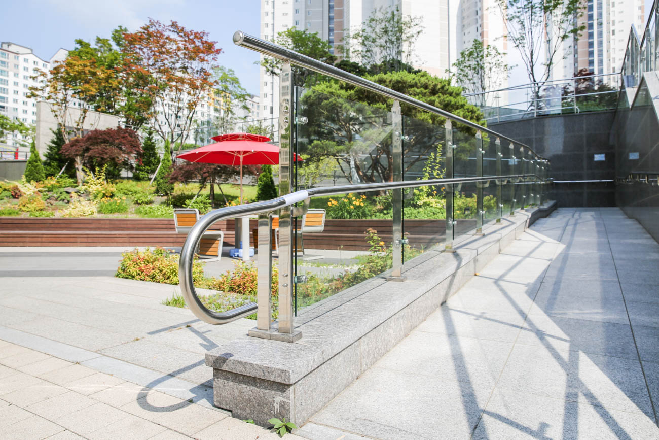 단지 내 1203동과 1206동 사이 썬큰 가든 공간에는 강화유리 난간이 설치되었습니다.
