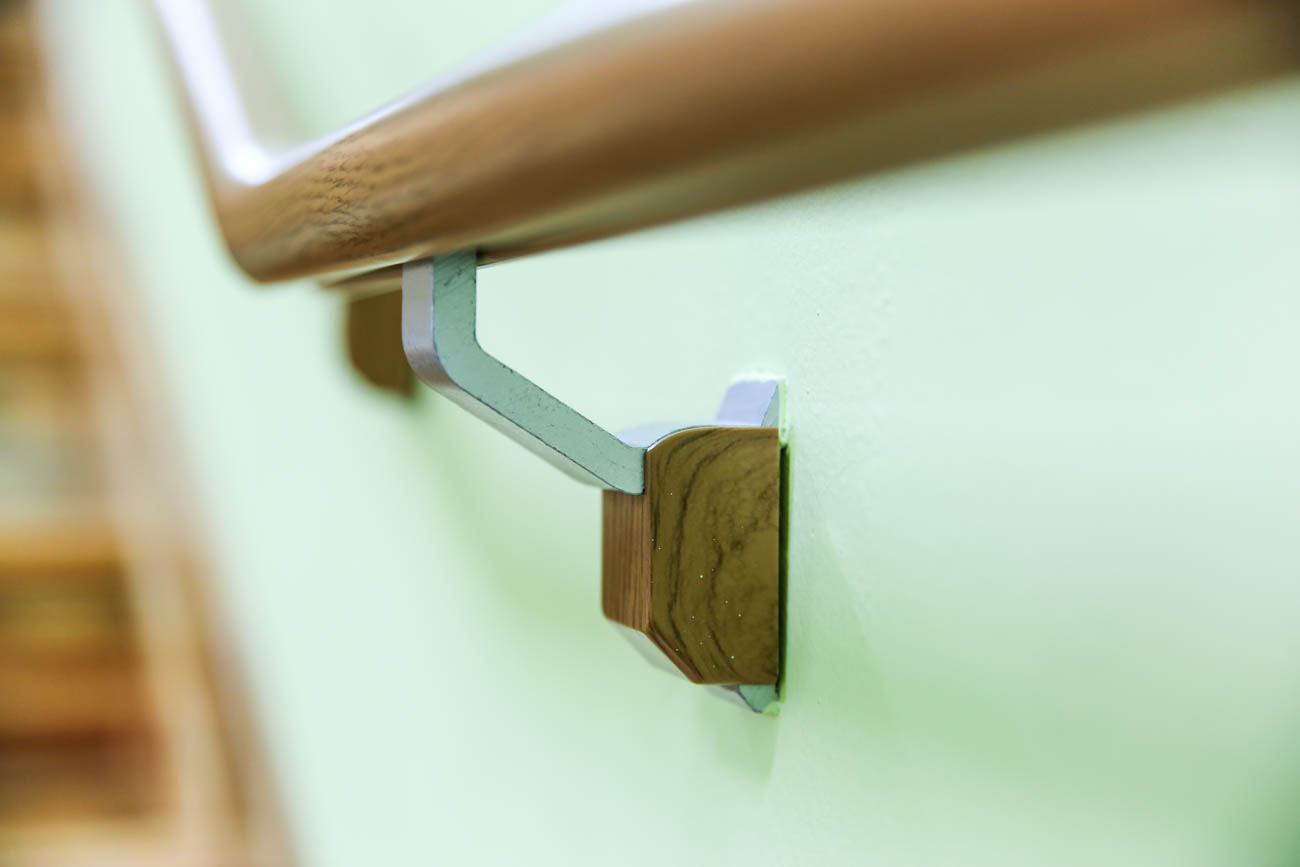아이들의 키를 고려해 낮은 위치에 시공된 벽부형 핸드레일은 합성수지 + 알루미늄 PVC 재질로 제작되었습니다.