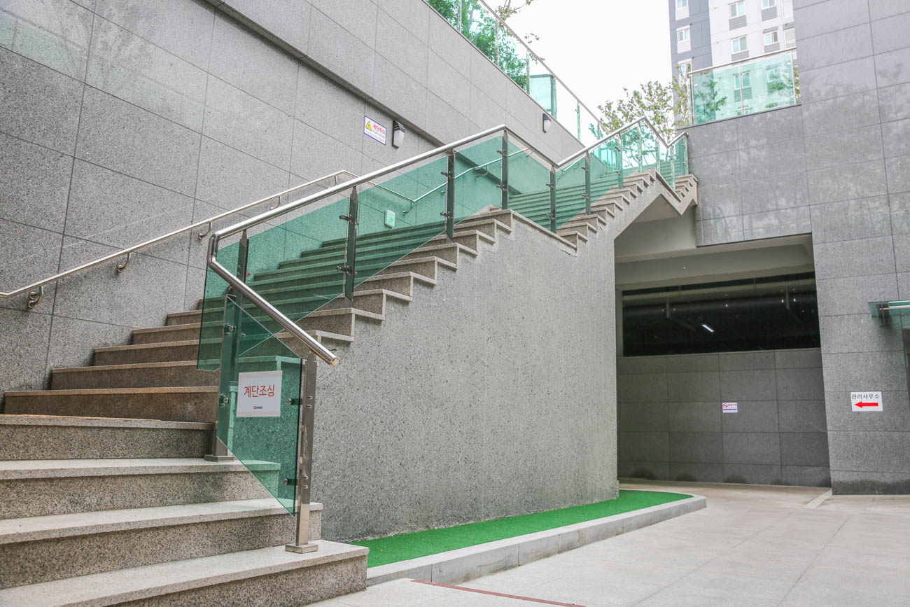 지하 주차장으로 연결되는 넓은 썬큰 구간에는 그린 컬러 강화유리가 적용되었습니다.