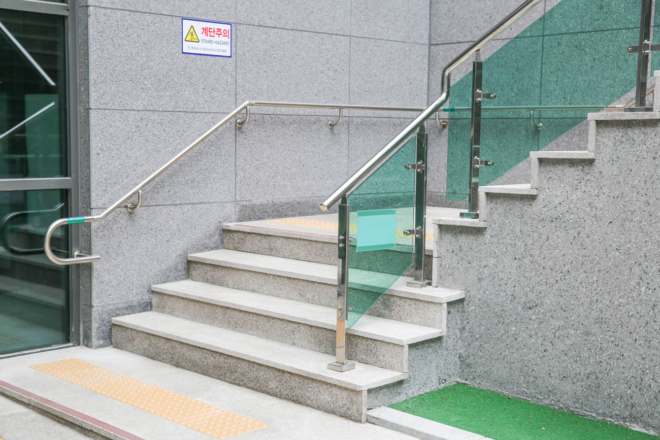 상단을 전체적으로 둘러 안전성을 확보했고, 계단 구간에서도 그린 컬러 난간이 동선을 명확히 안내합니다.