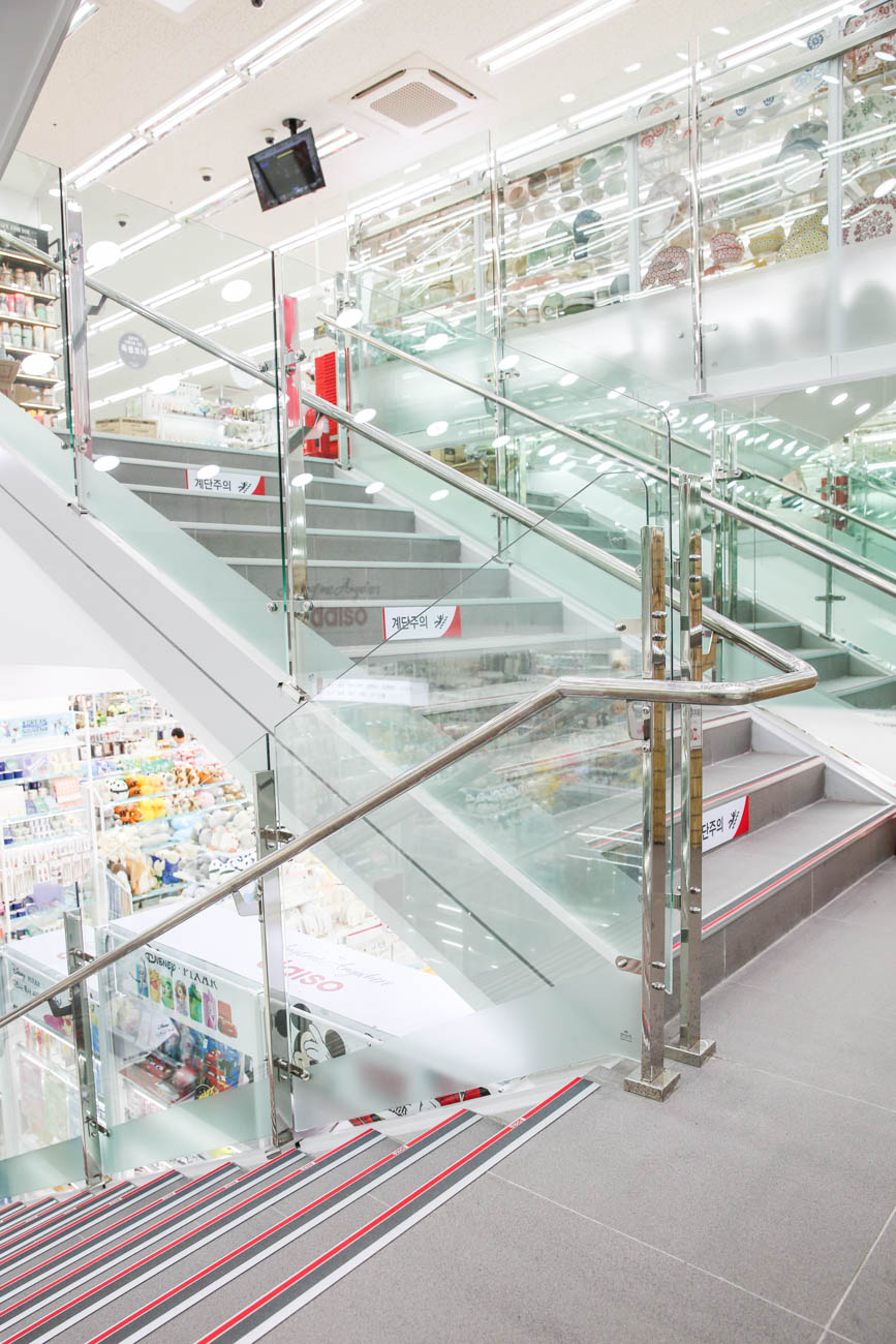 출입구에서 왼쪽으로 이동하면 보이는 계단 구간에 저희 강화유리난간이 2층까지 설치되어 있습니다.