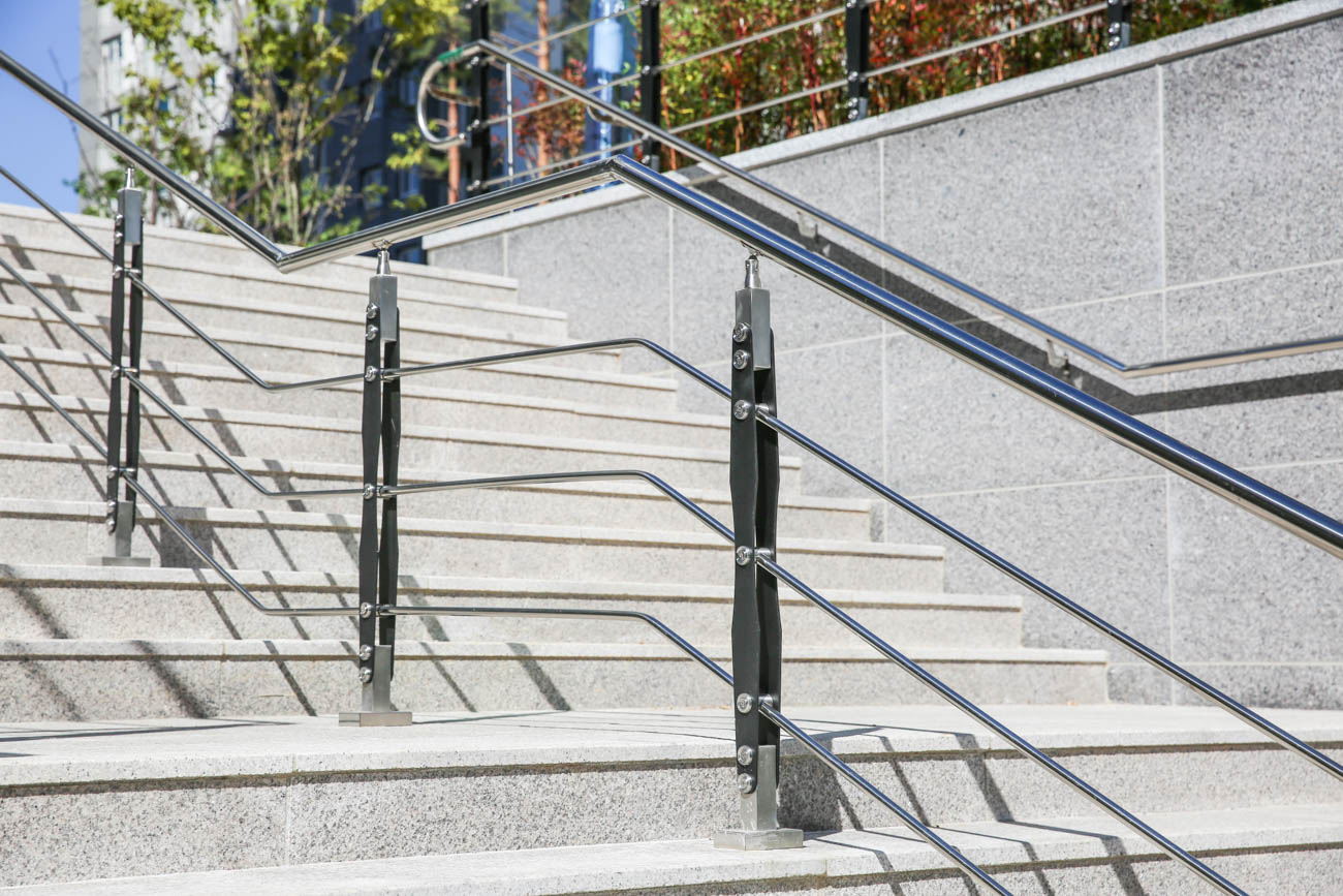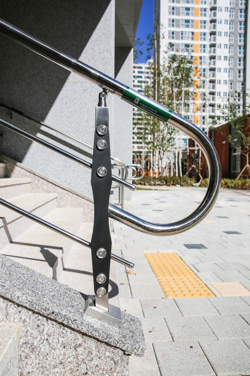 특히 엘리베이터 주변 계단 구간에는 난간몰에서 설치한 스텐 평철 블랙도장 난간이